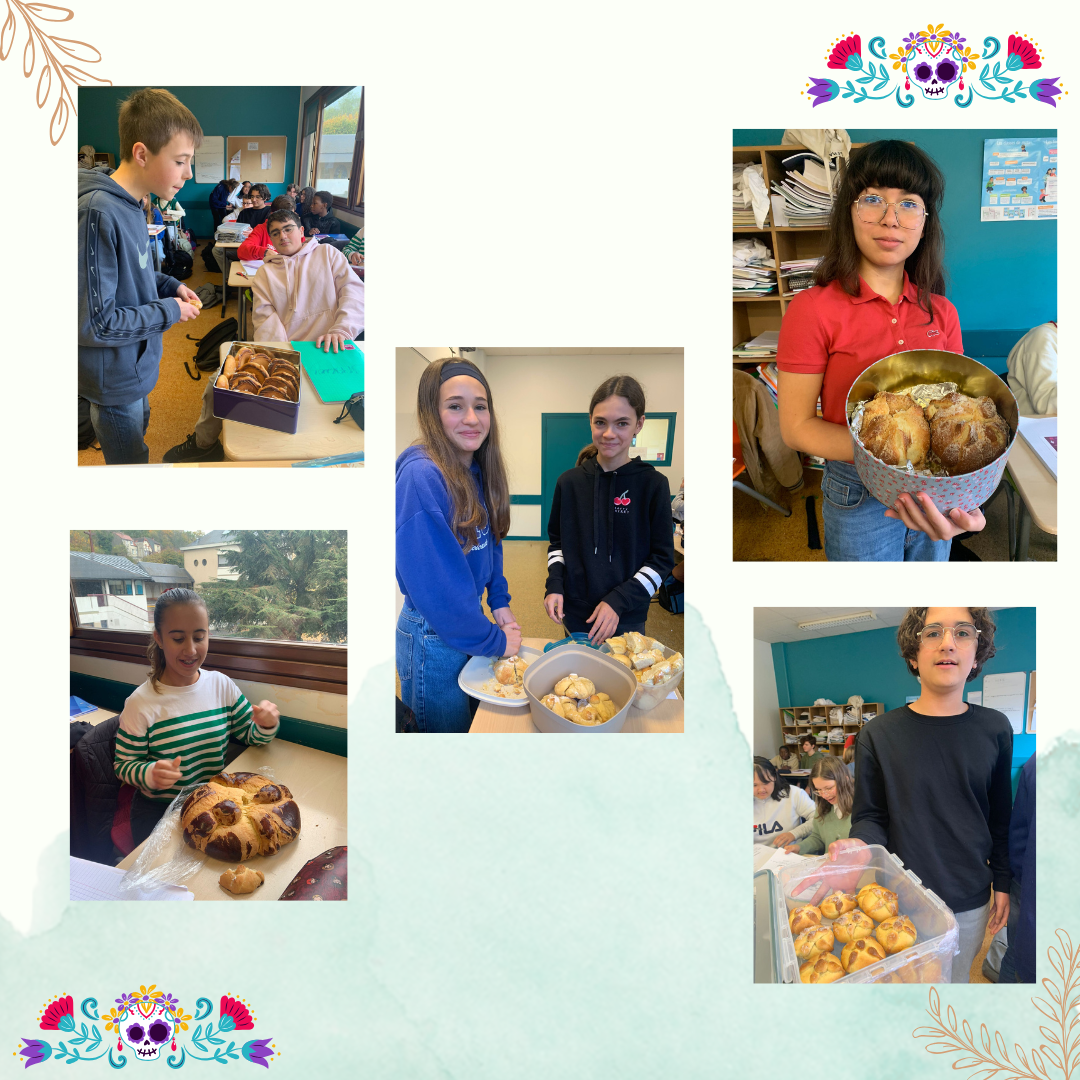 L’élément emblématique de cette fête est le pan de muerto, un pain sucré décoré de formes représentant des os et recouvert de sucre. Plus qu’un simple met, il symbolise le cycle de la vie et le souvenir des disparus. Nos 4ème ont donc clôturés le cours d’espagnol sur « Día de Muertos » en réalisant la recette chez eux. Nous avons pu goûter ces douceurs lors d’une dégustation en classe.