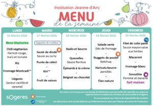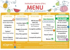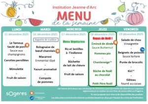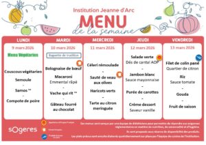 Les menus qui vous sont présentés ici sont conçus par une équipe de diététiciens de notre partenaire SOGERES pour permettre de répondre aux exigences réglementaires en matière de nutrition, de saisonnalité et d’hygiène.